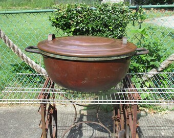 Antique Copper Candy Kettle . Antique heavy copper dovetails candy kettle handled bowl pot, 15 dia x 7 7/8 t. Solid copper , steel handles, 24diameter x.